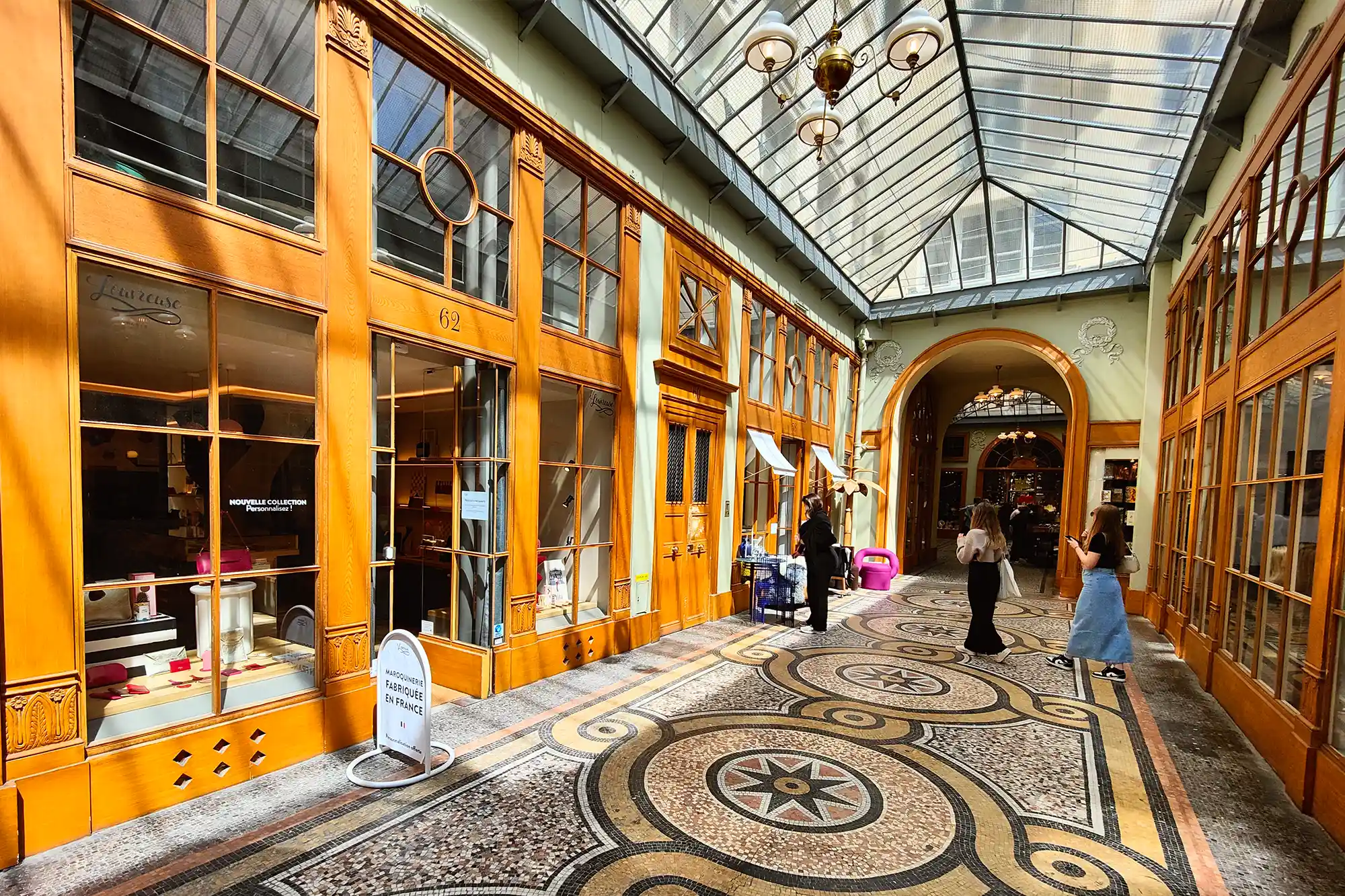 Een van de meest opvallende details is de mozaïekvloer. Deze bestaat uit duizenden kleine tegels die samen geometrische patronen vormen. De vloer loopt door de hele galerij en is een van de mooiste voorbeelden van historische passagevloeren in Parijs.