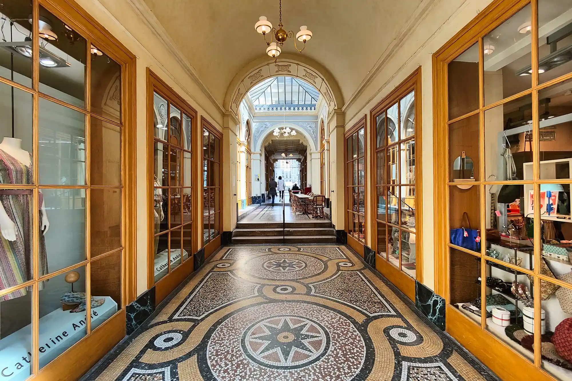 Langs de galerij staan elegante winkelgevels met bogen, pilaren en klassieke ornamenten. Veel van deze gevels zijn nog origineel, waardoor de passage een authentieke uitstraling heeft behouden....