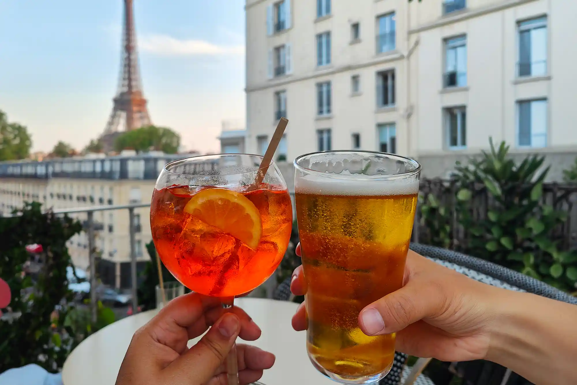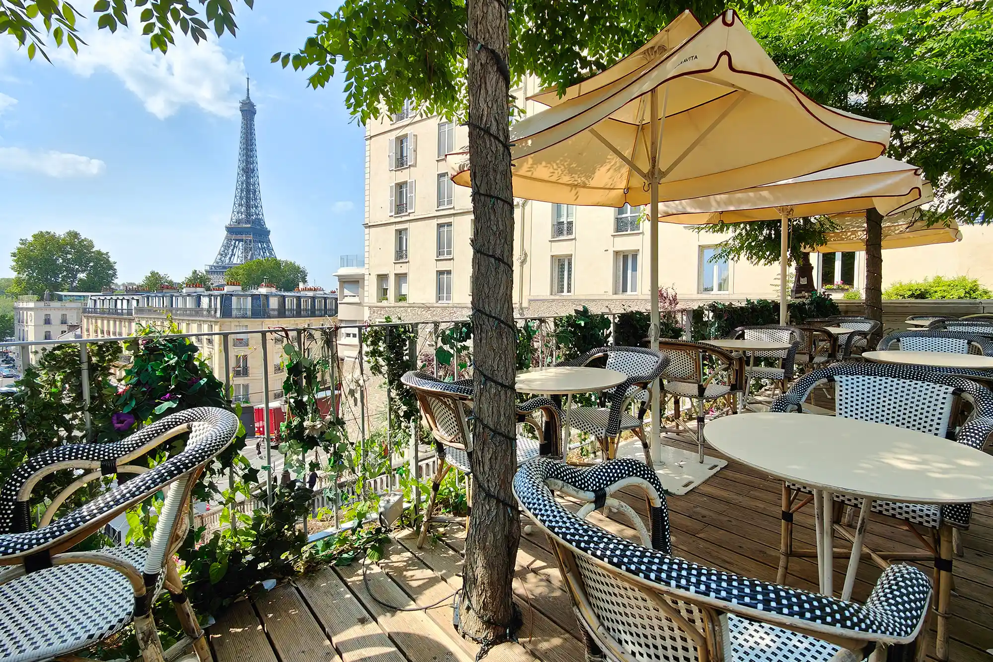 Het terras van Bamini is een van de grootste troeven van het restaurant. Vanaf hier kijk je direct uit op de Eiffeltoren, wat vooral bij zonsondergang een mooi decor vormt voor een maaltijd.