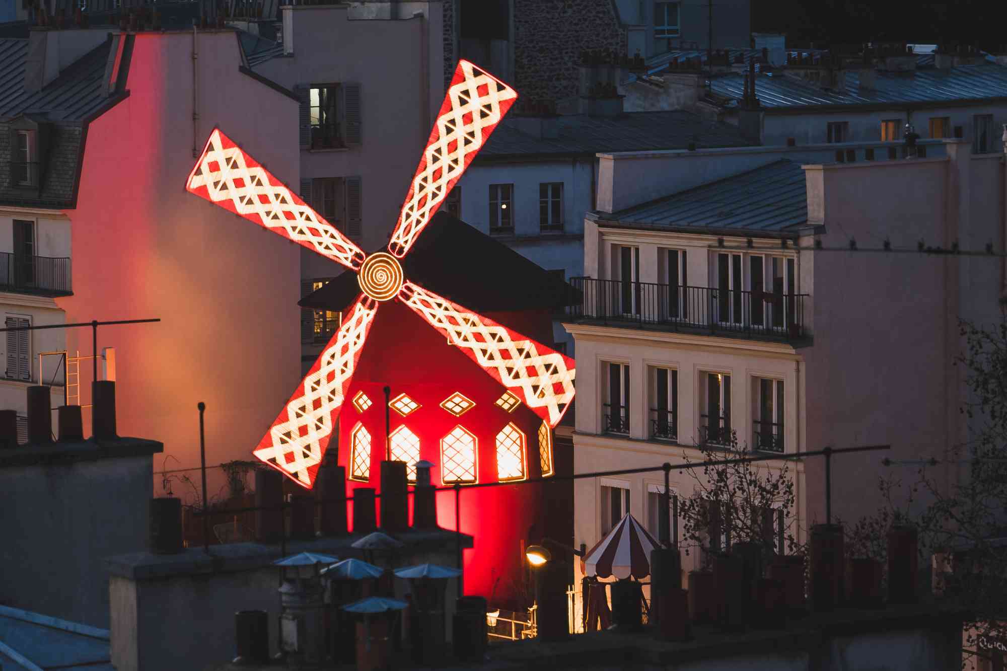 De Moulin Rouge is een van de bekendste cabarets van Parijs en ligt in het 18e arrondissement, aan de voet van Montmartre. Het iconische gebouw met de rode molen op het dak is wereldwijd bekend en trekt al sinds de negentiende eeuw bezoekers van over de hele wereld.