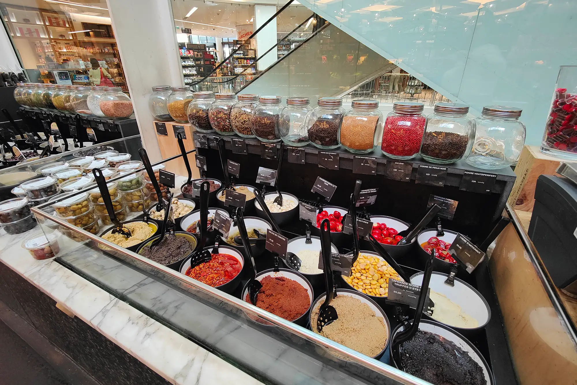 Alles in La Grande Épicerie is zorgvuldig gepresenteerd. De groente- en fruitafdeling lijkt bijna een stilleven, met perfect gerangschikte ingrediënten die je meteen inspireren om te gaan koken. Hier vind je producten die je niet snel ergens anders ziet: zeldzame peerensoorten, bloemenhoning, ambachtelijke pasta’s uit kleine Italiaanse dorpen en jams met smaken die je waarschijnlijk nog nooit eerder hebt geproefd.