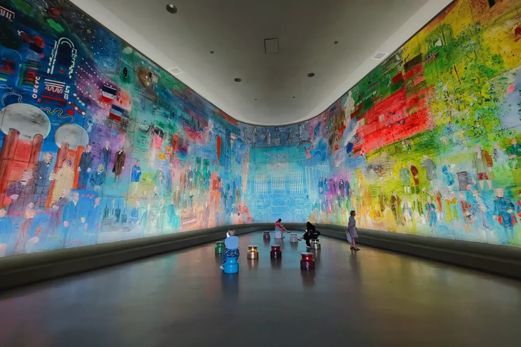 Een van de meest bijzondere overblijfselen van de wereldtentoonstelling van 1937 is La Fée Électricité van Raoul Dufy. Dit gigantische schilderij werd speciaal gemaakt voor de tentoonstelling en is nog altijd gratis te bewonderen in het Musée d’Art Moderne de Paris. In het midden zie je een energiecentrale, daaromheen zijn meer dan honderd wetenschappers en uitvinders afgebeeld.
